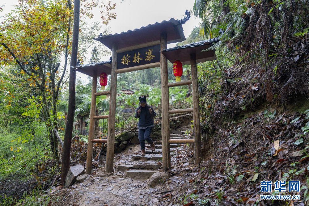 張維珍在深山里打造的“棕林寨”,宛如世外桃源,別具特色的寨門就是在網(wǎng)友的建議下修建的。新華網(wǎng)發(fā) 康林?jǐn)z