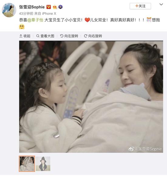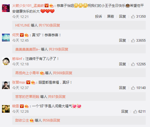 孟美岐甜喊汪峰和章子怡的孩子為“小王子”;何炅為兩人兒女雙全感到十分高興:“真‘好’,恭喜恭喜”;早前妻子剛生下三胎的張晉也在評論中感嘆一家人“眼里都是幸福,真好!”;前《ELLE》中國主編曉雪也表示:“一個‘好’字是人間最大福氣!”;一同和章子怡錄過節目的魏大勛也為辣媽送上了自己的祝福;張雪迎則甜喊章子怡為“大寶貝”:“恭喜@章子怡,大寶貝生了小小寶貝!兒女雙全!真好真好真好!!!想抱”。