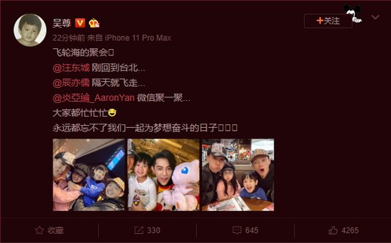 照片中,吳尊和辰亦儒分別抱起neinei和Max,汪東城在一旁拿玩偶合影,幾人對鏡自拍時而扮鬼臉時而大笑,氣氛融洽有愛。吳尊在文中寫道:“飛輪海的聚會,汪東城剛回到臺北,辰亦儒隔天就飛走,炎亞綸微信聚一聚,大家都忙忙忙,永遠都忘不了我們一起為夢想奮斗的日子。”
