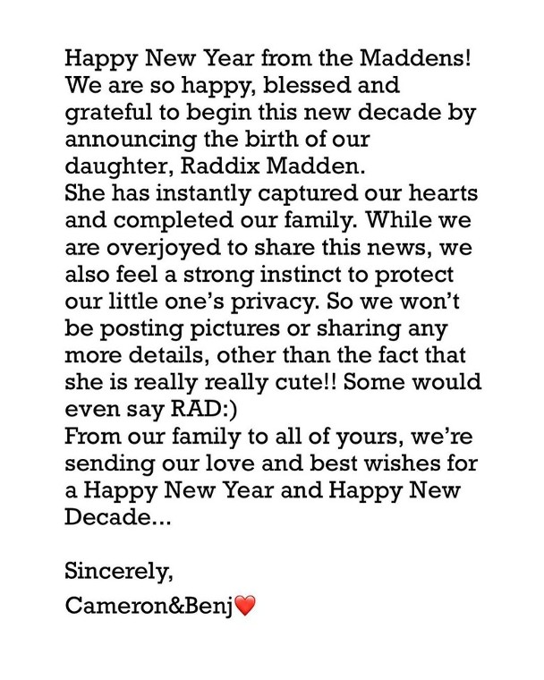 卡梅隆寫到:“Maddens一家祝大家新年快樂!我們好開心,好幸運同好感恩,在這個新年代宣布我們的女兒Raddix Madden來到這個世上。她一出世已經融化了我們的心,使我們家庭完整。”