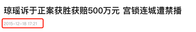 2014年12月,這樁在網上沸騰了9個月的版權糾紛案,終于有了結果——《宮鎖連城》確認侵犯《梅花烙》的改編權,作品不能再傳播,于正需賠償瓊瑤500萬。