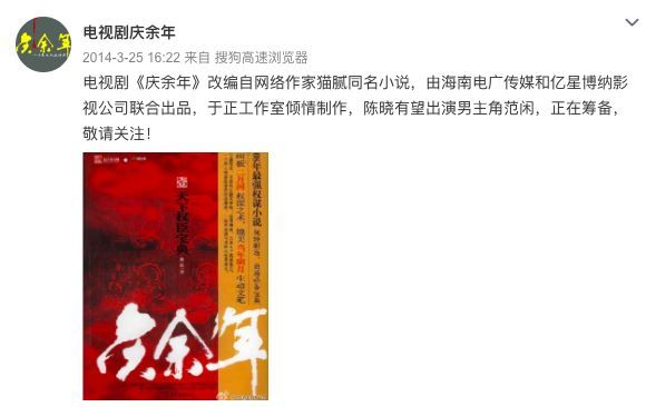 在2014年3月,名為“電視劇慶余年”的官微,發布了一條微博,表示《慶余年》將由于正工作室傾情制作,而于正旗下的男演員陳曉,有望出演范閑一角。