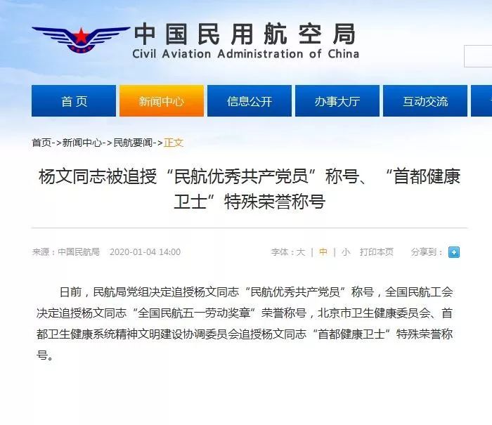 中國民航局官網消息,日前,民航局黨組決定追授楊文同志“民航優秀共產黨員”稱號,全國民航工會決定追授楊文同志“全國民航五一勞動獎章”榮譽稱號,北京市衛生健康委員會、首都衛生健康系統精神文明建設協調委員會追授楊文同志“首都健康衛士”特殊榮譽稱號。
