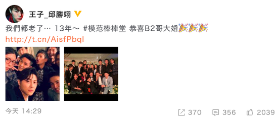 網易娛樂1月5日報道 1月5日,邱勝翊(王子)分享一組偶像男子組合棒棒堂成員的合體照,配文“我們都老了? 13年~#模范棒棒堂 恭喜B2哥大婚。”照片中幾人合體參加康熙制作人陳彥銘(B2)的婚禮,對鏡頭比耶氣氛溫馨。