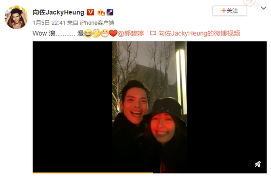 網易娛樂1月6日報道 1月5日,向佐在微博曬出與郭碧婷同框拍攝的視頻。視頻中,郭碧婷戴著黑色漁夫帽出鏡,對著向佐甜蜜說道:“下雪了”,向佐則回應道:“2020年第一場雪,北京大雪,耶!”兩人站在雪地里,笑容燦爛,互動十分有愛。