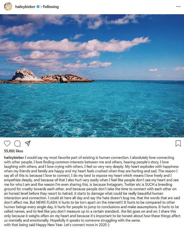 據外媒報道,年僅23歲的海莉,作為擁有2400萬粉絲的人氣博主和超級巨星賈斯汀·比伯(Justin Bieber)的妻子,她在個人社交網站時常受到網友的抨擊。1月3日,她發表長文呼吁新的一年人與人之間多一些善良和溝通,這也不是她第一次請求網友不要再為黑而黑。