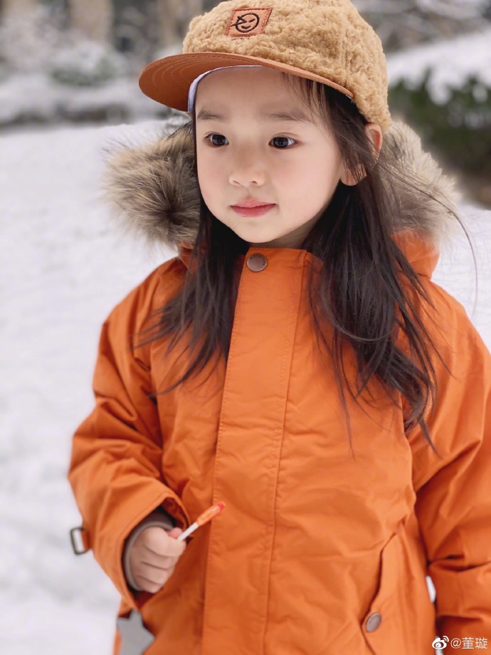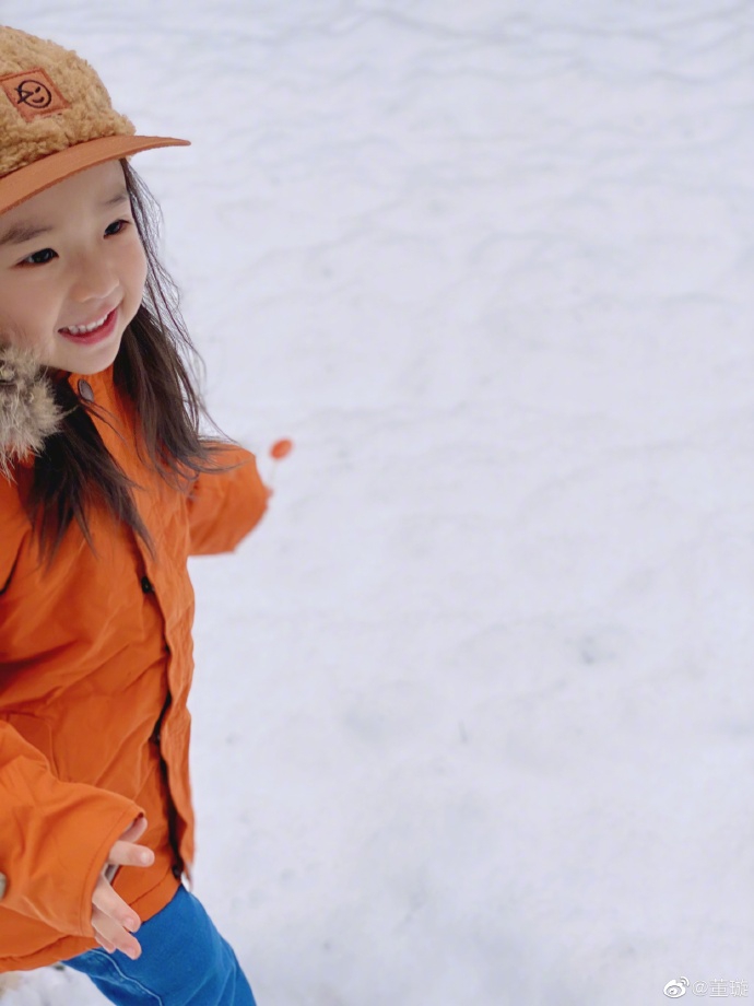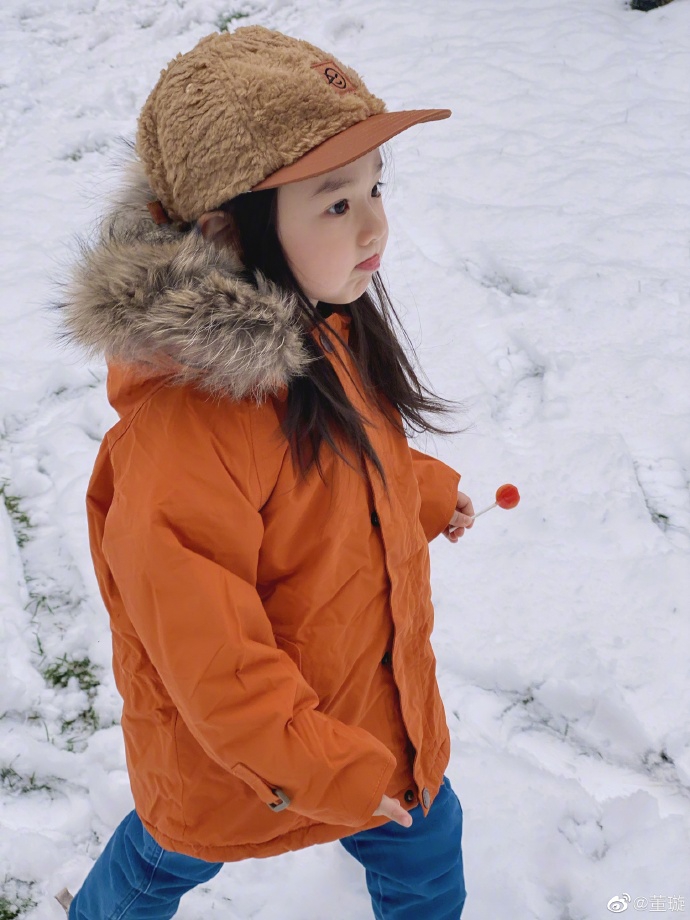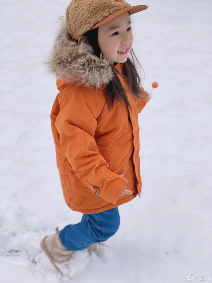 1月6日,董璇在微博曬出女兒小酒窩雪中玩耍照,并配文:“2020年的第一場雪”。照片中的小酒窩頭戴毛絨鴨舌帽,身穿橙色毛領外套和牛仔褲嬌俏可愛,一只手拿著棒棒糖,在白雪中奔跑大笑化身小仙女,繼承了媽媽董璇的大眼睛,皮膚白皙睫毛濃密,顏值超高。