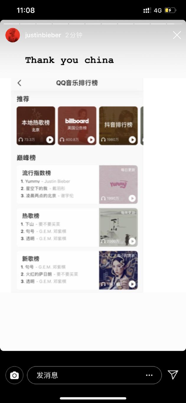 比伯1月3日推出自己的全新單曲《yummy》,國內兩大音樂平臺QQ音樂和網易云音樂也同步上線,并獲得榜單NO.1。比伯也更新ins稱“Thank you china”。