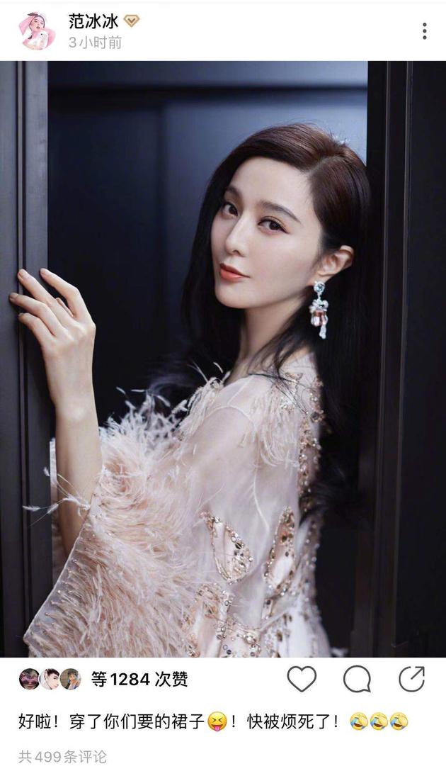 1月7日,范冰冰曬出美照,并配文:“好啦!穿了你們要的裙子!快被煩死了!”照片中的她身穿金箔羽毛連衣裙,手扶門框側(cè)身微笑輕盈飄逸,淡粉色的裙身和花型耳飾柔媚可人,搭配清淡妝容微卷長(zhǎng)發(fā)仙氣十足。網(wǎng)友紛紛評(píng)論:“太好看了吧”“穿裙子好美的哦”。