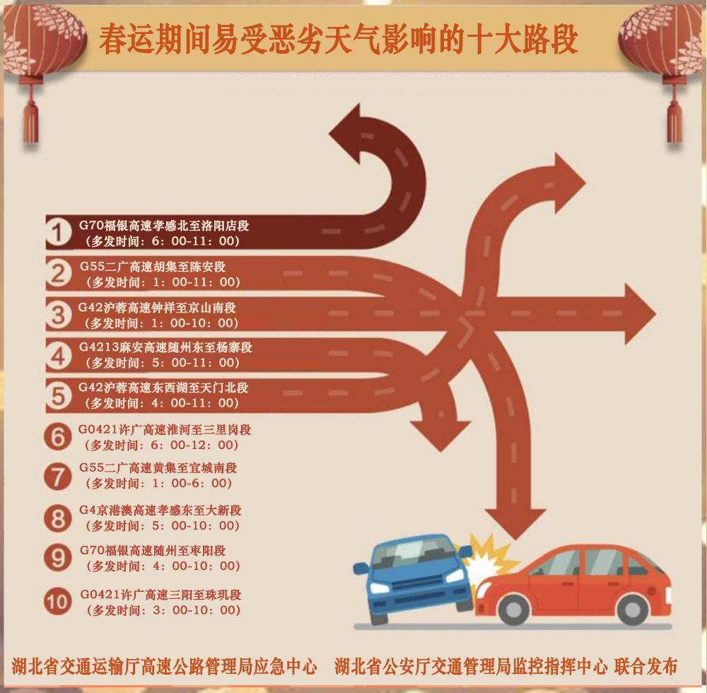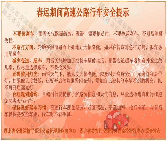 溫馨提示:春運(yùn)期間,湖北省公安廳高速公路警察總隊將在交通事故易發(fā)、多發(fā)路段加強(qiáng)警力部署,聯(lián)合多部門在重點(diǎn)路段開展疏堵保暢工作,對常規(guī)堵點(diǎn)、事故高發(fā)點(diǎn)、施工路段、互通合流點(diǎn)專人管控,綜合采取電子地圖預(yù)設(shè)繞行線路、廣泛發(fā)布預(yù)警提示、收費(fèi)站重點(diǎn)疏導(dǎo)、重要點(diǎn)路段視頻監(jiān)控、高音喇叭語音提示、提示牌警示、無人機(jī)定點(diǎn)抓拍、交叉路段物理隔離、互通路段定點(diǎn)疏導(dǎo)等交通組織措施,切實(shí)提高通行效率,對輕微事故,實(shí)施快處機(jī)制保障道路安全暢通。