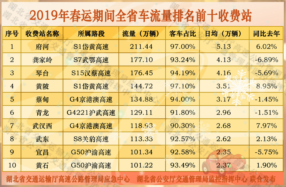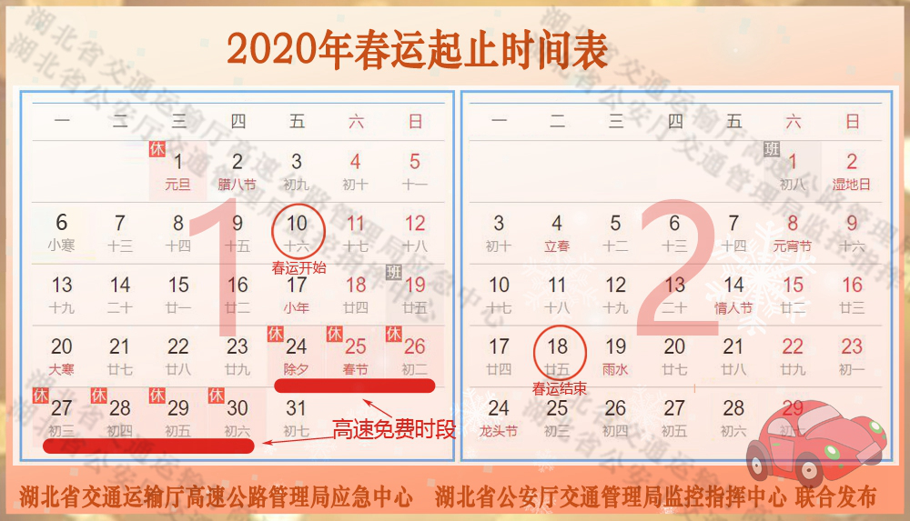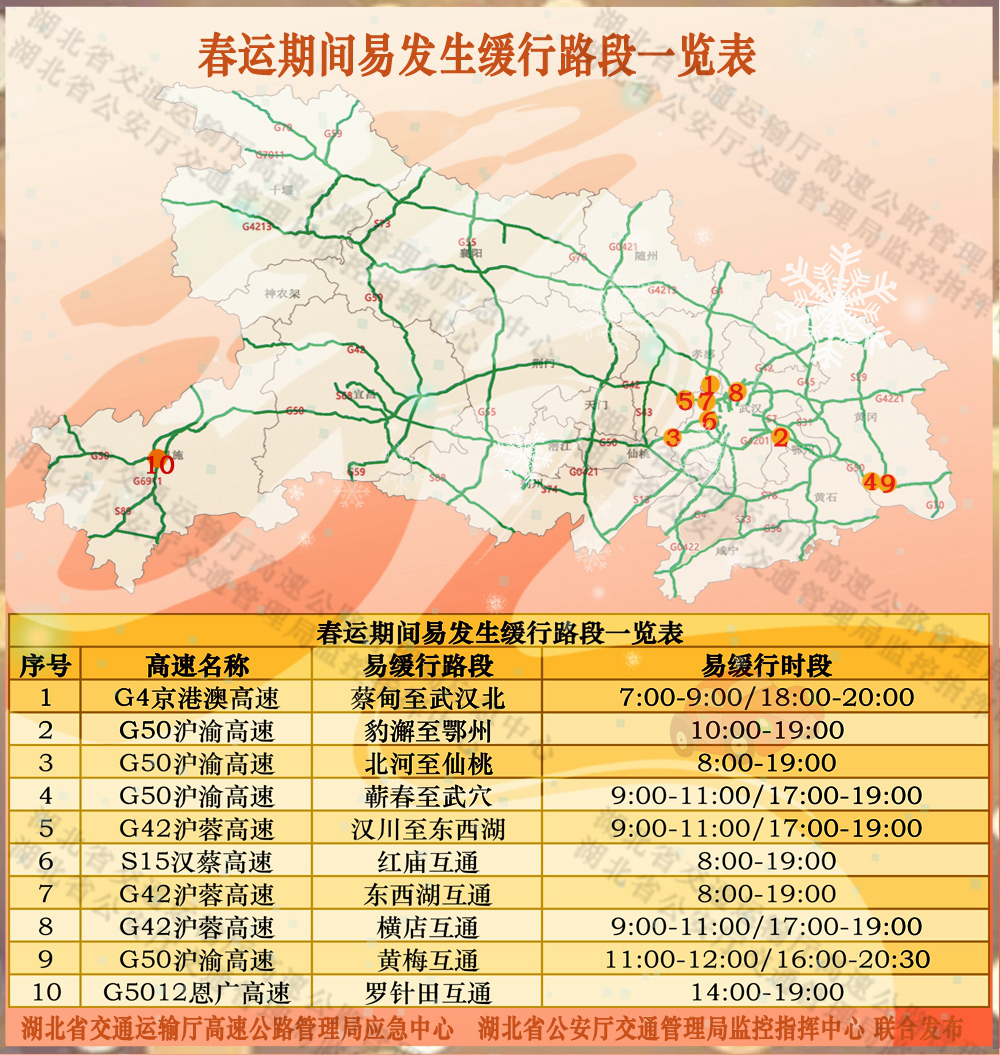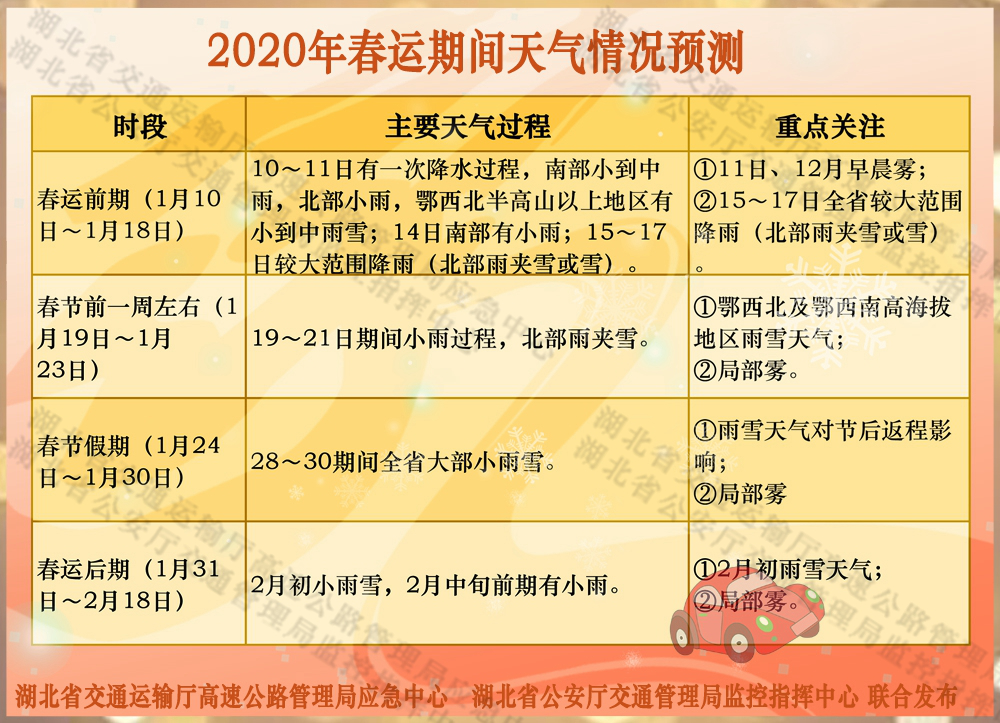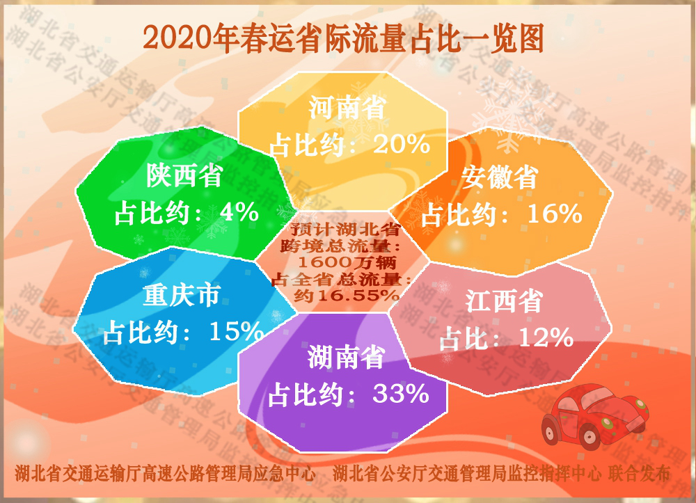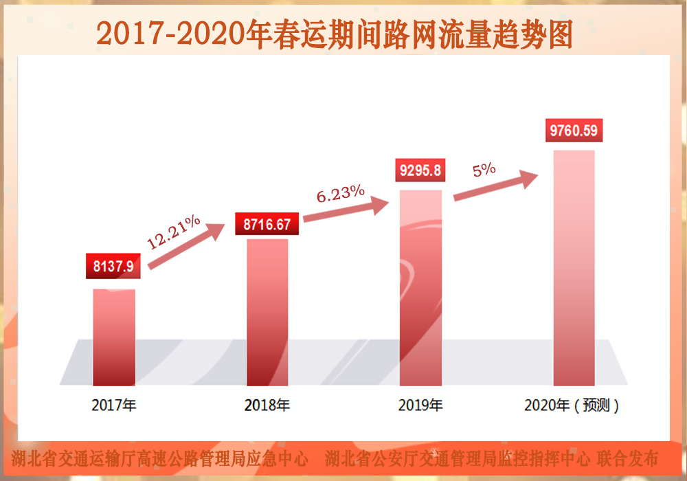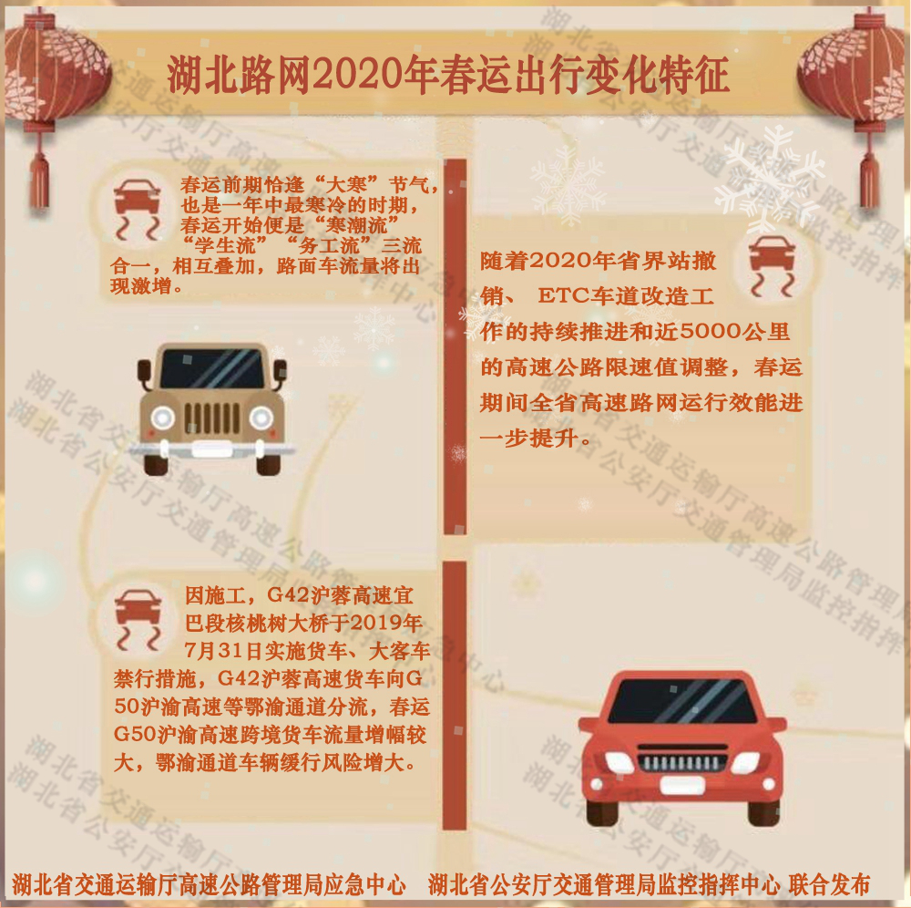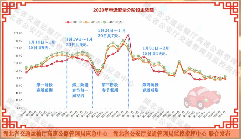 荊楚網(wǎng)客戶端—荊楚網(wǎng)消息(記者趙秀琳 、徐浩、通訊員李文立、雷穎、吳海鵬)2020年春運(yùn)1月10日(臘月十六)開始,2月18日結(jié)束,共計40天。湖北省交通運(yùn)輸廳高速公路管理局根據(jù)歷年來春運(yùn)期間路網(wǎng)運(yùn)行情況分析指出,預(yù)計2020年春運(yùn)出行特點(diǎn)主要體現(xiàn)在四個階段,路網(wǎng)運(yùn)行態(tài)勢將呈現(xiàn)前期外地返鄉(xiāng)車流攀升、春節(jié)前省內(nèi)返鄉(xiāng)車流高峰、春節(jié)假期探親出行車流反彈及春節(jié)后車流震蕩走低四種趨勢。