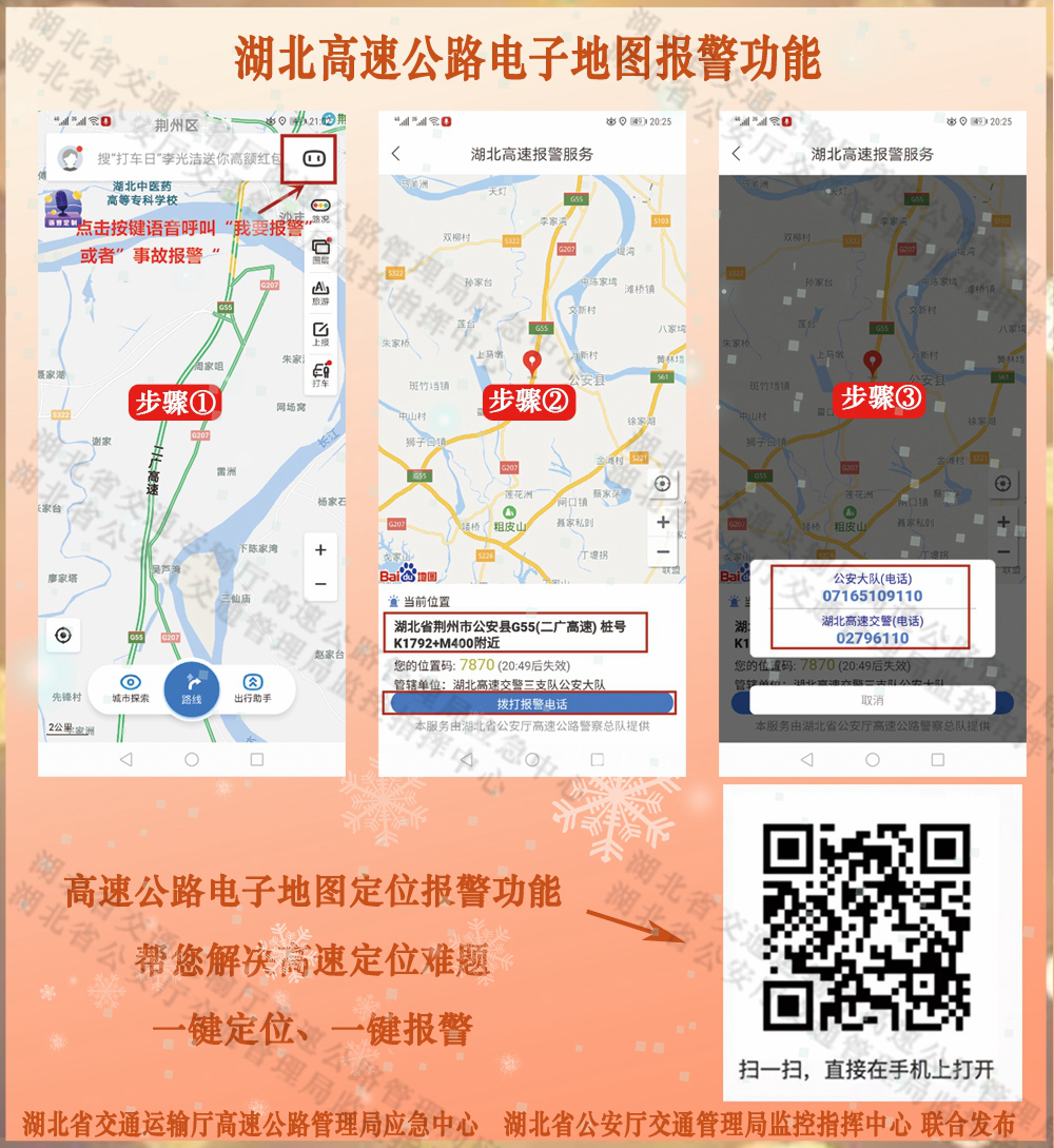 司乘朋友如果在湖北高速公路上發(fā)生需緊急報警求助的情況時,除了撥打報警電話027-96110外,還可以通過在百度地圖或百度APP程序內(nèi),語音呼叫或搜索框搜索“湖北交警96110”小程序,可以智能展示報警人位置,將報警人位置信息提供給接警員,能夠讓民警更快找到報警人。具體操作如下圖所示: