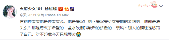 1月7日晚,楊超越在社交賬號發文吐槽理發店,稱理發店為“屠宰場”,表示“今天只想哭泣”她寫道:“有的理發店他是理發店么,他是屠宰廠啊?屠宰美少女美麗的夢想啊,他那是洗頭么?那是熄滅了希望的一盆水吹倒我最后的驕傲的一縷風。別人的錯還是懲罰了自己,對不起我今天只想哭泣。”