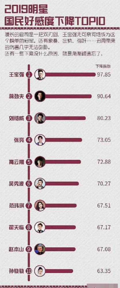 日前,有媒體發布2019年明星國民好感度下降榜單。top10中,王寶強、蔣勁夫、劉愷威、張亮等人榜上有名。而馬蓉也疑似發文諷刺王寶強好感度下降,她稱:“謠可以造,營銷可以買,新聞可以做,飯可以亂吃,話可以亂說。唯獨沒有感情的機器大數據做不了假。”暗示到自己被多次造謠,唯獨沒有感情的機器大數據做不了假。