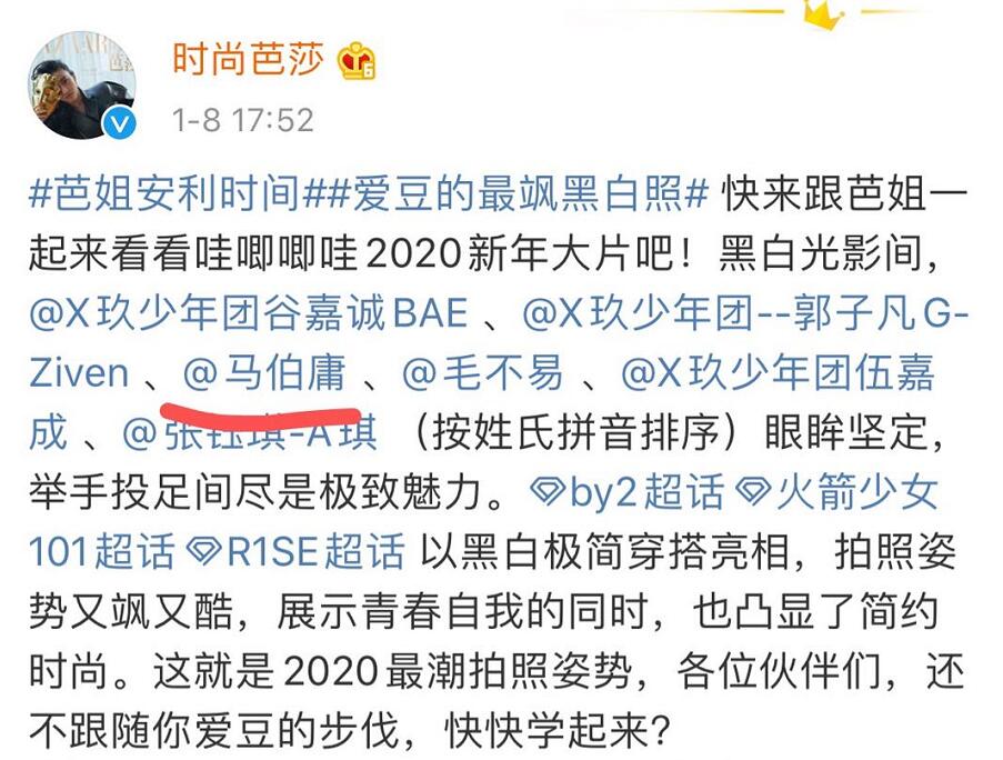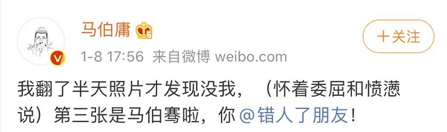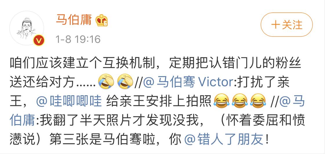 1月8日,時尚芭莎在社交平臺發布哇唧唧哇2020新年大片時,將馬伯騫的賬號艾特成了馬伯庸,引來本尊回復。馬伯庸轉發該條內容:“我翻了半天照片才發現沒我”提示官方艾特錯了人。隨后,馬伯騫轉發道:“打擾了親王,哇唧唧哇給親王安排上拍照。”馬伯庸還打趣道,“咱們應該建立個互換機制,定期把認錯門兒的粉絲送還給對方。”