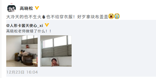 近日,有網友在微博上曬出高曉松赤裸上身赤裸抱枕的照片,并表示:“高曉松老師做錯了什么!! 1月9日,高曉松轉發并回復:“大冷天的也不生火,也不給穿衣服!好歹拿塊布蓋蓋”。網友紛紛圍觀并評論道:“夏天的高老師,艷,冬天的高老師,冷艷…”“大緊 你又在搜自己名字了”“仿佛一個赤裸的監考老師”。