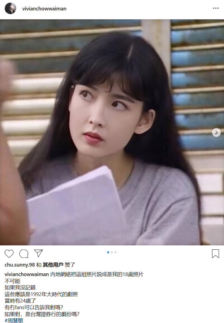1月8日,周慧敏在個人社交網站曬出以前的劇照,并發文:“如果我沒記錯,這些應該是1992年大時代的劇照,當時有24歲了。”照片中,24歲的周慧敏頭發烏黑濃密,氣質清純,少女感十足。