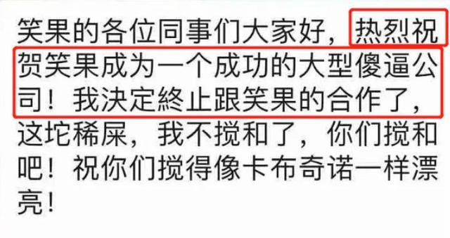 隨后,有網友曝光了疑似池子群發給笑果文化公司所有同事的一段文字,在文中,池子稱終于決定終止和笑果的合作了,并怒罵這個公司是一個大型傻X公司,直言公司像坨屎。
