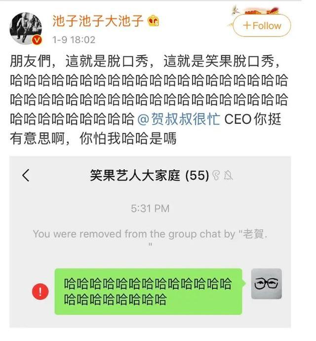 1月9日晚,池子曬出一張聊天記錄截圖,截圖顯示,池子在笑果藝人大家庭的群聊中發了一條“哈哈哈”的訊息,卻發現被笑果文化CEO賀曉曦移除了群聊,導致信息發送失敗。