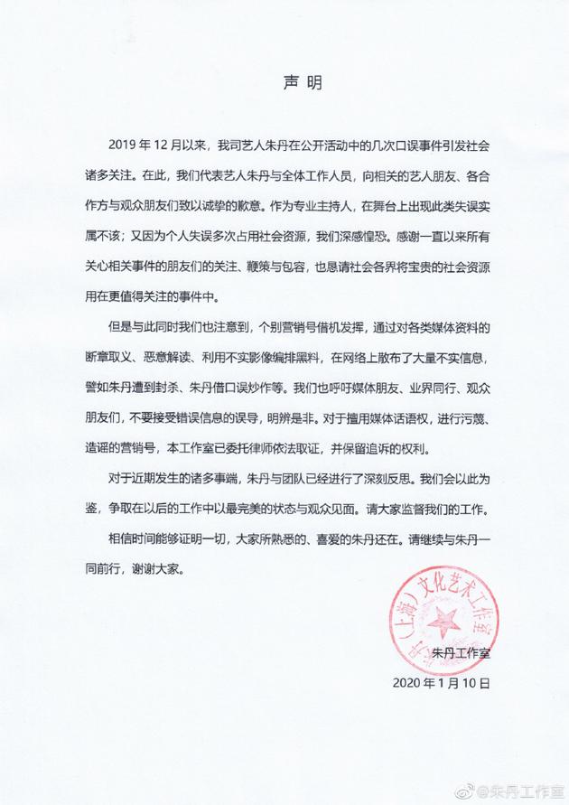 1月10日,朱丹工作室發(fā)表聲明,針對朱丹在公開活動中幾次口誤引發(fā)大家關(guān)注的事件,表達(dá)歉意,感謝大家的關(guān)心和鞭策。但是個別營銷號借機(jī)發(fā)揮,斷章取義、惡意解讀、散步大量不實信息的行為,律師已依法取證,并保留追訴權(quán)利。