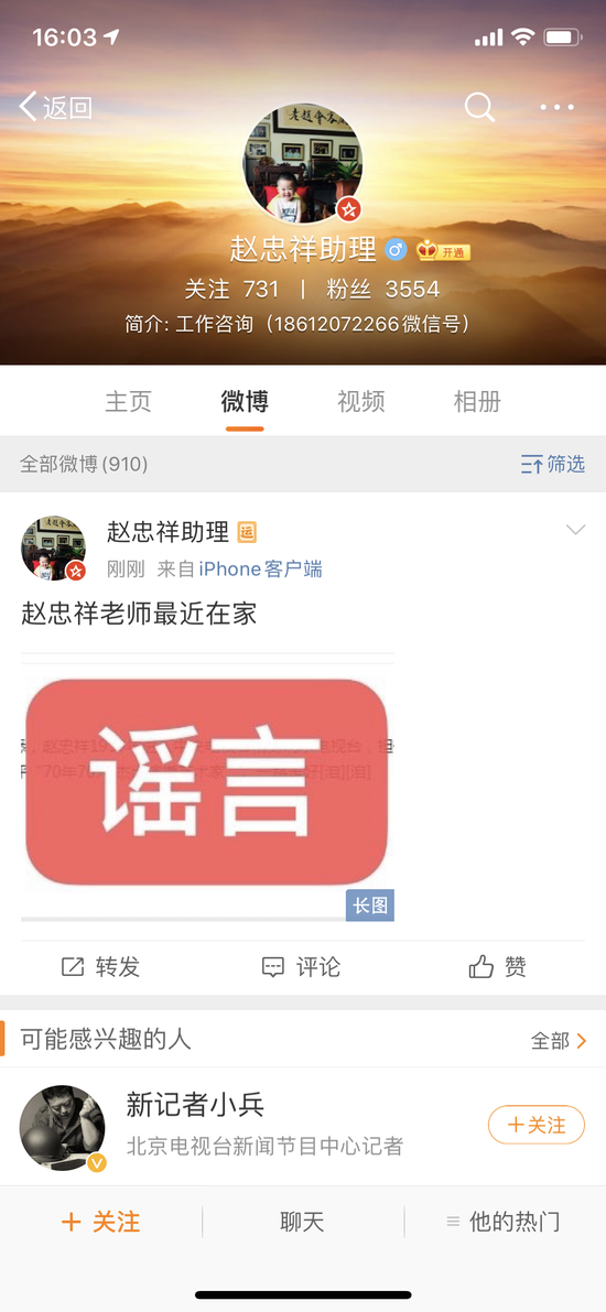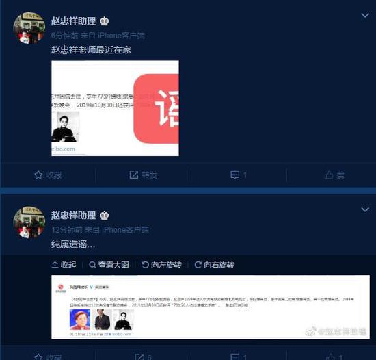 隨后,微博名為“趙忠祥助理”的用戶辟謠,表示趙忠祥老師最近在家。不僅如此,該用戶還掛住出某網站報道關于趙忠祥去世的新聞,稱純屬謠言。