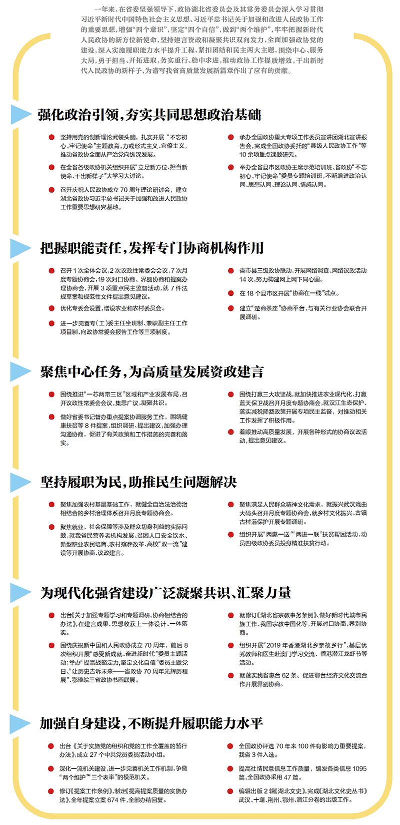 一年來,在省委堅強領導下,政協湖北省委員會及其常務委員會深入學習貫徹習近平新時代中國特色社會主義思想、習近平總書記關于加強和改進人民政協工作的重要思想,增強“四個意識”,堅定“四個自信”,做到“兩個維護”,牢牢把握新時代人民政協的新方位新使命,堅持建言資政和凝聚共識雙向發力,全面加強政協黨的建設,深入實施履職能力水平提升工程,緊扣團結和民主兩大主題,圍繞中心、服務大局,勇于擔當、開拓進取,務實重行、穩中求進,推動政協工作提質增效,干出新時代人民政協的新樣子,為譜寫我省高質量發展新篇章作出了應有的貢獻。
