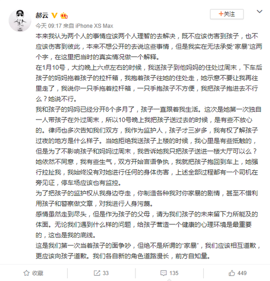 1月12日,搖滾歌手郝云在微博就此前前妻稱其家暴做出正式回應,他表示這完全是前妻為了搶走自己對孩子的監護權而進行的人身污蔑,并詳細地敘述了當天的情況。郝云稱自己當天只是為了把孩子送到前妻的住所內,而前妻卻一直表示不愿意,之后郝云就想把孩子帶回,結果兩人發生了爭執,當自己絕對沒有動手對前妻進行傷害。