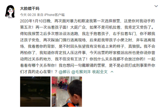 1月11日凌晨,疑似郝云妻子王珊珊在網上發長文控訴郝云家暴:這是你對我動手的第五次!再一次當著孩子面!