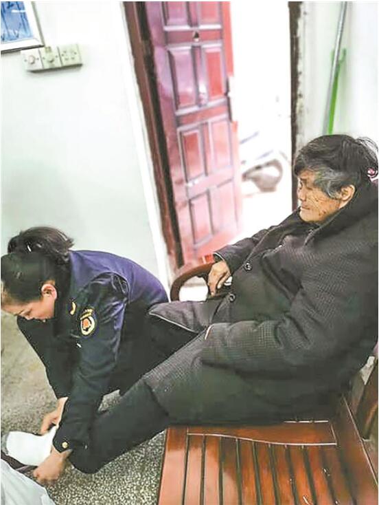有隊員發現老人雙手冰涼,且未穿襪子,馬上拿來一雙新襪子給老人穿上(如圖),并打開空調暖風,端來熱水給老人喝。