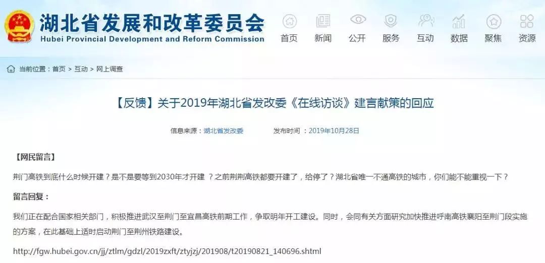 在這則“【反饋】關于2019年湖北省發改委《在線訪談》建言獻策的回應”的信息里,一名網友提問:作為目前湖北省唯一不通高鐵的城市,荊門的高鐵到底什么時候開建?