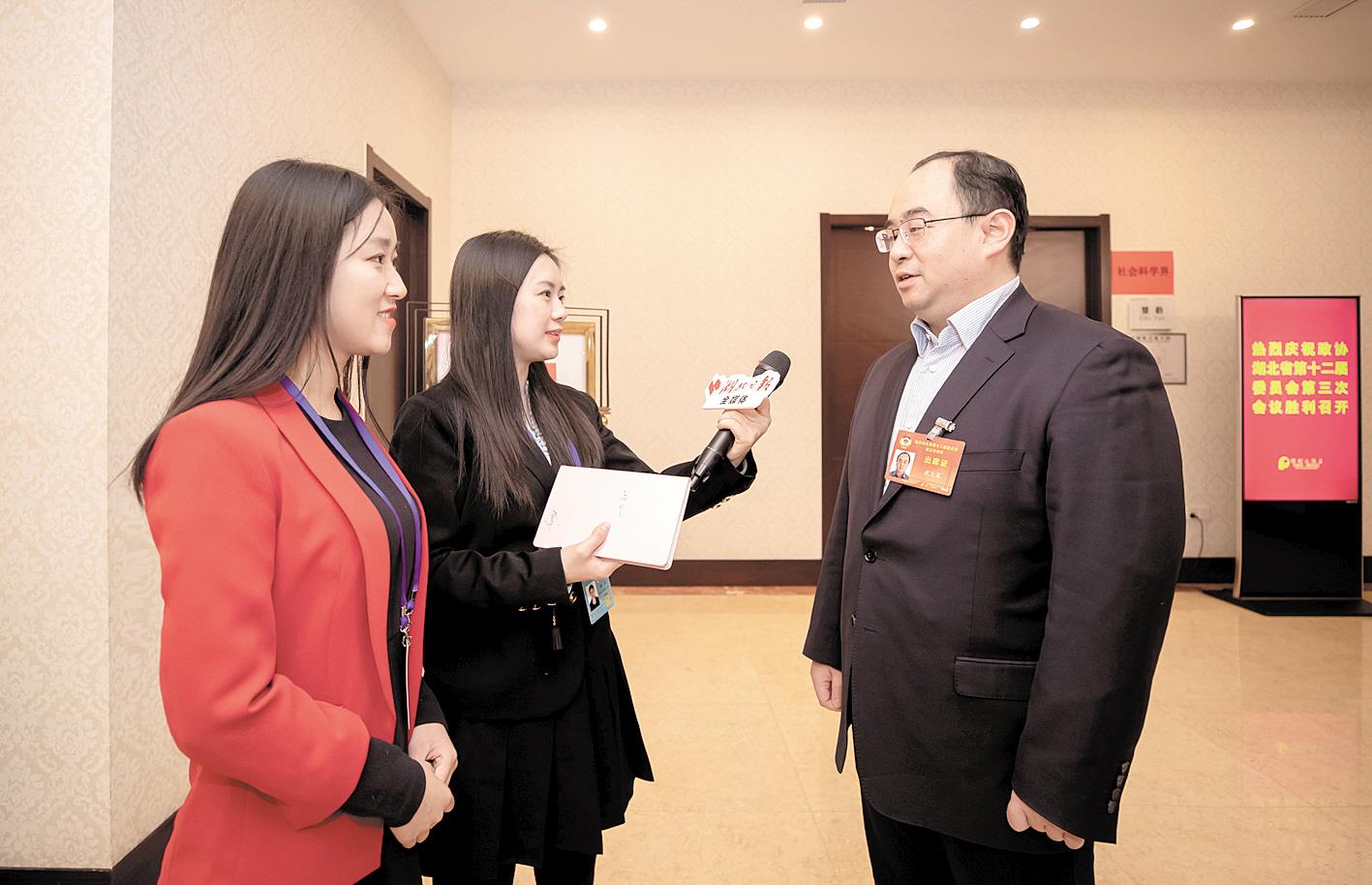 “姊妹花”記者楊康(中)、黃潔如(左一)采訪武義泉委員。(湖北日報全媒記者 柯皓 攝)