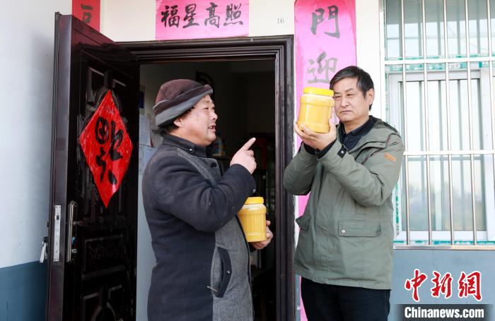 秦勇(右)查看村民收割的蜂蜜 周政 攝