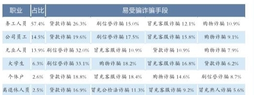 武漢市公安局反電信網(wǎng)絡(luò)詐騙中心專門制作了受害人職業(yè)與受詐騙類型關(guān)聯(lián)表格。(圖表2)