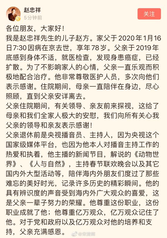 1月16日,趙忠祥之子趙方證實(shí),趙忠祥今日因病在京去世,享年78歲;趙忠祥去年年底就醫(yī)發(fā)現(xiàn)癌癥擴(kuò)散。