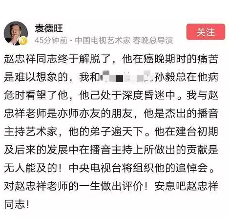 1月16日,中央電視臺著名主持人趙忠祥因病在北京去世,享年78歲。趙忠祥之子趙方透露,父親在2019年年底查出身患癌癥。曾導演春晚的袁德旺在悼念趙忠祥的短文中,透露趙忠祥在患癌晚期遭受的痛苦難以想象,自己曾在趙忠祥病危時探望,當時的趙忠祥就已經(jīng)處于重度昏迷當中。