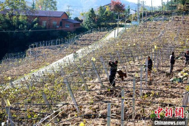 村民們正在為獼猴桃修剪枝條 周政 攝