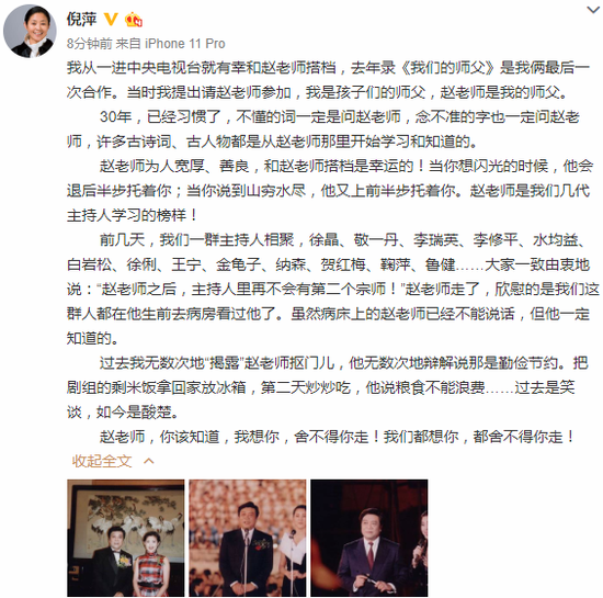 倪萍悼念全文:我從一進中央電視臺就有幸和趙老師搭檔,去年錄《我們的師父》是我倆最后一次合作。當時我提出請趙老師參加,我是孩子們的師父,趙老師是我的師父。