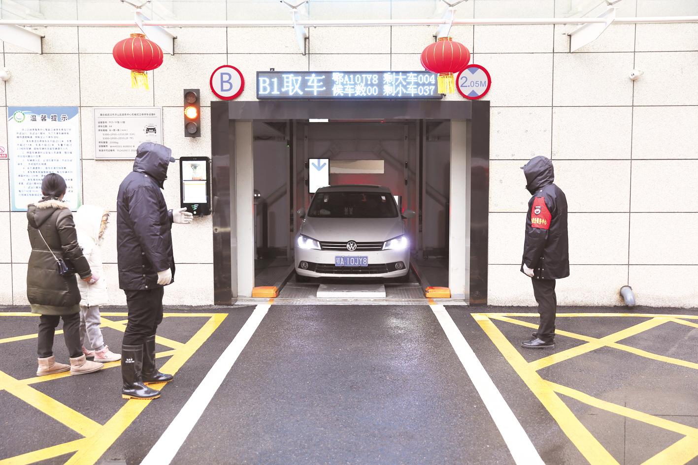 在洪山區行政審批中心立體車庫前,停車的市民“一鍵取車”。
