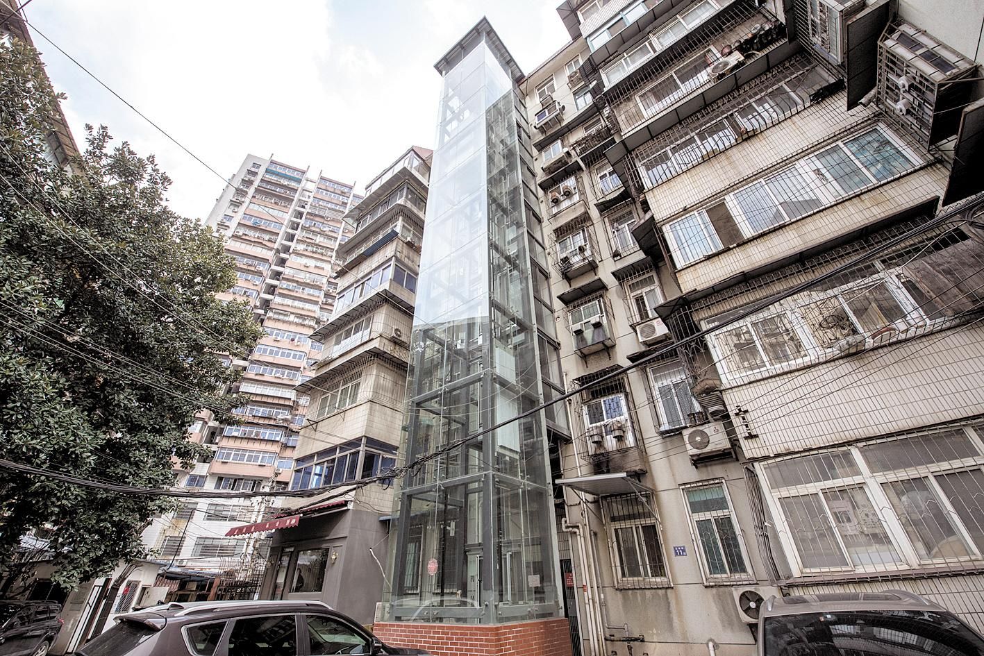武漢市云林街九頭鳥小區,經過改造加裝透明電梯的居民樓。 (湖北日報全媒記者 魏錸 攝)