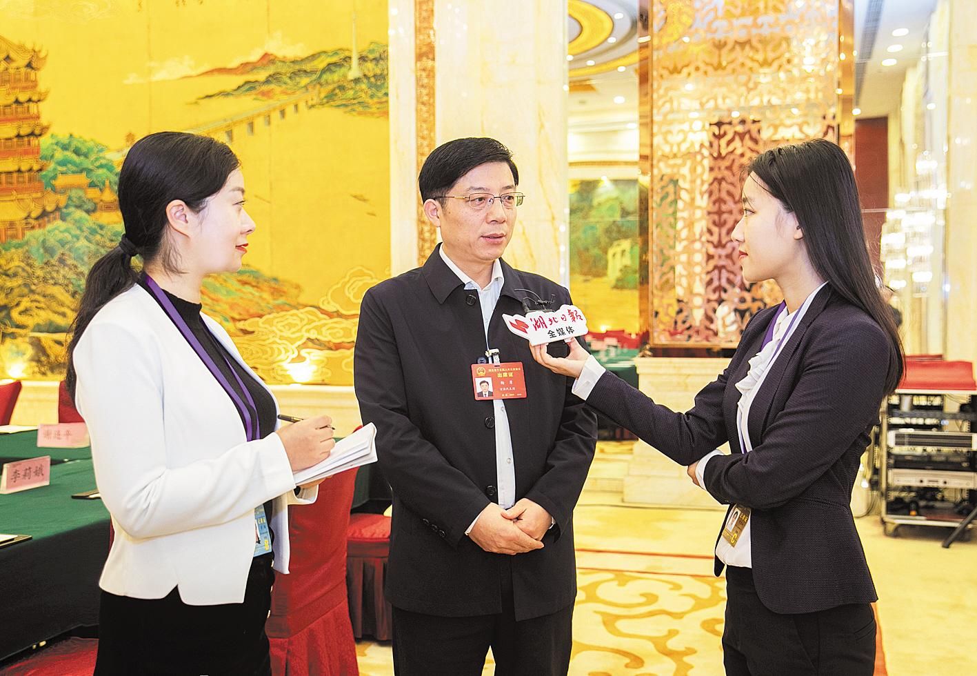 宜昌代表團(tuán)楊勇代表接受“姊妹花”記者黃璐(左)、黃潔如(右)采訪。(湖北日?qǐng)?bào)全媒記者 柯皓 攝)