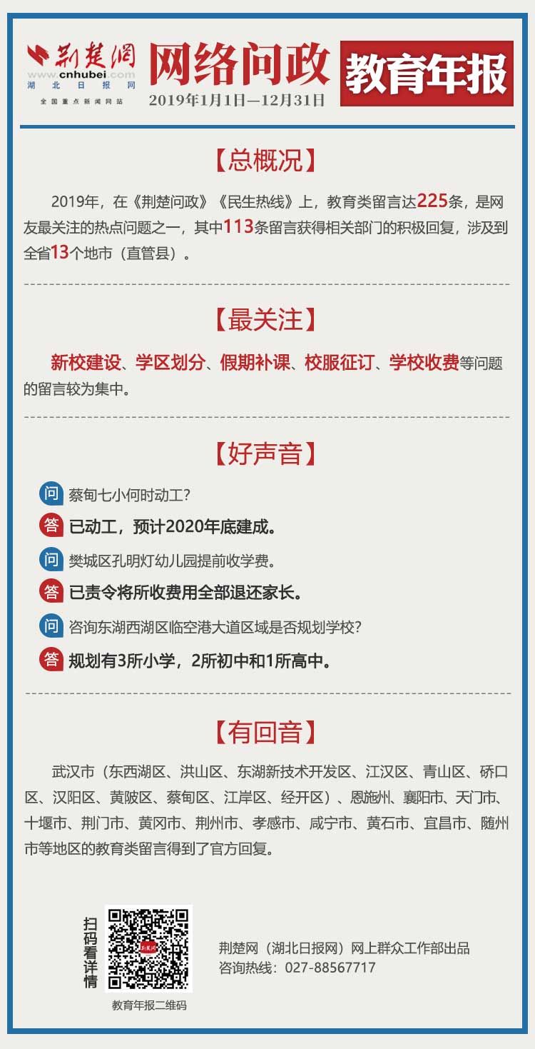 荊楚網客戶端—荊楚網消息(記者 王舒嫻、范慧瑾)“孩子在蘄春縣第二實驗小學上二年級,一年多的時間,已經訂購了七套校服,有必要嗎?”“我是黃石市黃石港區中山小學六年級學生家長,孩子學的是語文出版社的S版教材,考試卻考人教版的教材,會影響孩子小升初嗎?”“臨空新城第一學校何時投入使用?”“蔡甸七小何時動工?”……2019年,在《荊楚問政》《民生熱線》上,教育類問題受到網友廣泛關注,其中百余條問題獲得相關部門的積極回復,涉及到全省13個地市(直管縣),本網問政欄目組分地區為您詳細梳理!對著列表看看,這些問題您家孩子也遇到了不?自家小區秒變學區房了嗎?……