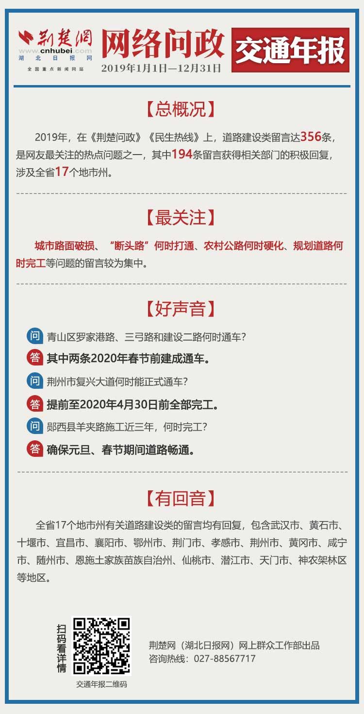 荊楚網客戶端—荊楚網消息(記者 劉文穎 范慧謹)道路建設作為影響百姓日常出行的“頭等大事”,一直以來都備受網友關注。2019年,荊楚網《荊楚問政》《民生熱線》共收到相關留言356條,其中194條得到有關部門回復,涉及全省17個地市州,不少“斷頭路”打通了,農村公路硬化了,規劃道路開工了……