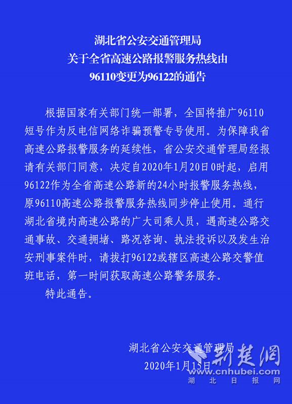 荊楚網客戶端—荊楚網消息(記者 張揚)1月20日,記者從湖北省交管局獲悉,我省高速公路報警服務熱線已由96110變更為96122。
