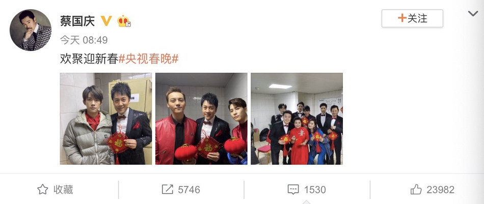 1月21日,蔡國(guó)慶在微博曬出春晚后臺(tái)和易烊千璽、陳偉霆、王嘉爾、阿云嘎、鄭云龍等人的合影,并配文:“歡聚迎新春”。據(jù)悉,2020年春晚是蔡國(guó)慶第23次登上春晚的舞臺(tái)。
