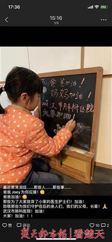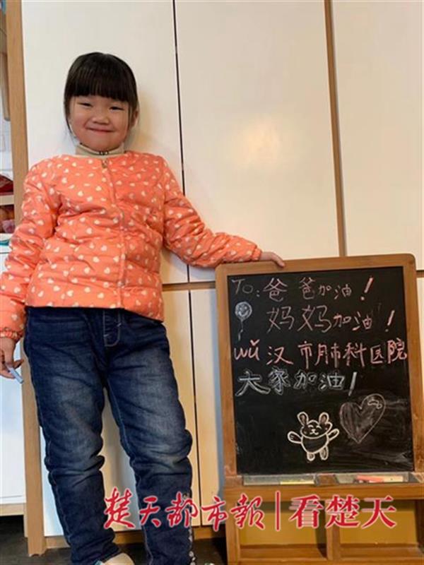當爺爺奶奶告訴她:“爸爸媽媽在抗擊肺炎第一線,非常辛苦。”她在家中寫下“爸爸加油!媽媽加油!武漢市肺科醫院加油!”還讓爺爺奶奶發給父母。