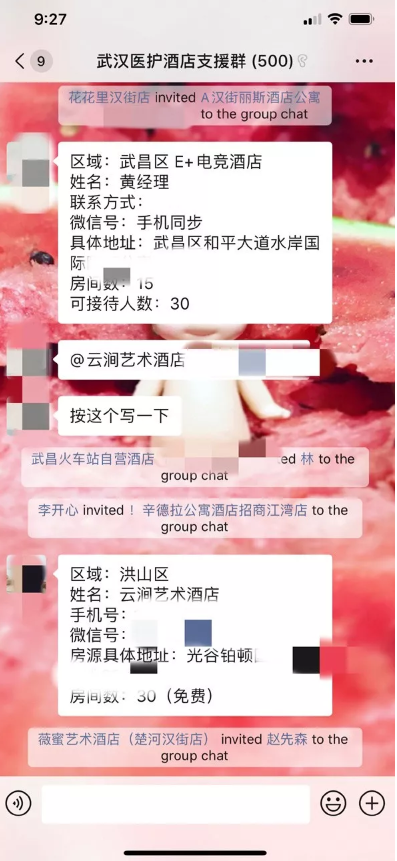“武漢醫護酒店支援群”的群主肖雅星是武漢當地的酒店業主,其名下的4家酒店全部參加此次支援。記者看到,肖雅星一邊在各群聯系、協調尋找包括84消毒液、口罩和紫外線燈等物資供應商,一邊不斷在群內發布自擬的《民間酒店入住人員與商家須知》。《須知》中,肖雅星提醒醫護人員自行做好防護,建議他們攜帶一次性用品;請酒店人員做好準備,記得退房后用75%醫用酒精消毒……