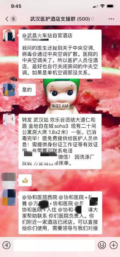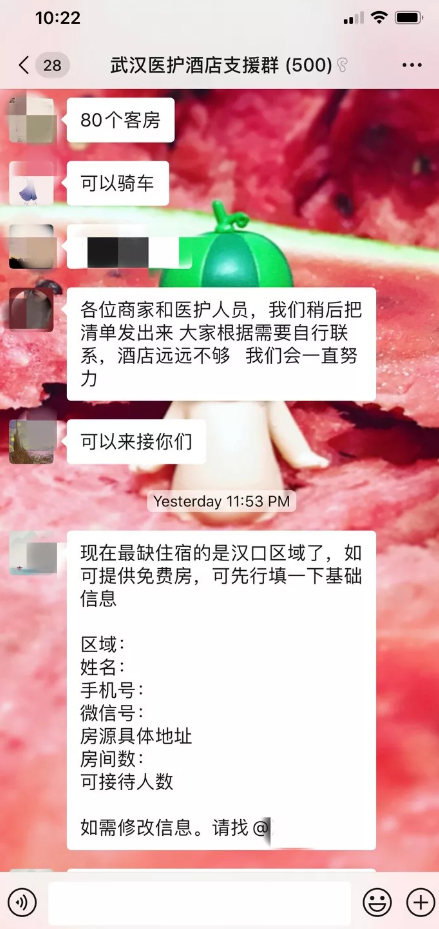 隨著疫情的升級,武漢的醫護人員幾近透支精力和體力。為了支援武漢的一線醫護人員,1月24日,當地的酒店業人士自發組織“武漢醫護酒店支援群”,征集不帶中央空調的酒店,自愿為武漢地區各大醫院的一線醫護人員免費提供住宿。