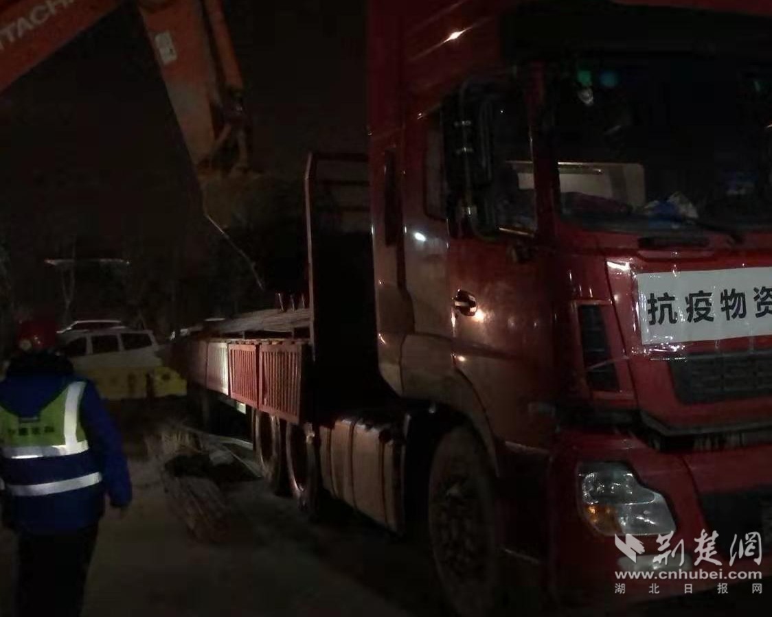 29日凌晨1時30分,70噸鋼材順利送達雷神山醫院建設施工現場。