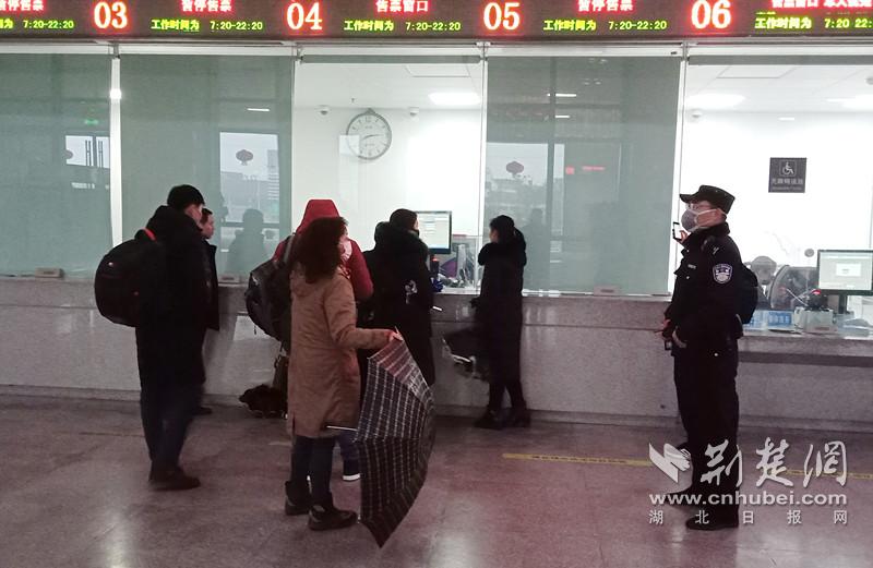1月25日,離開孝感市轄區通道暫時關閉,副所長李剛在售票廳引導旅客辦理退票。(通訊員供圖)