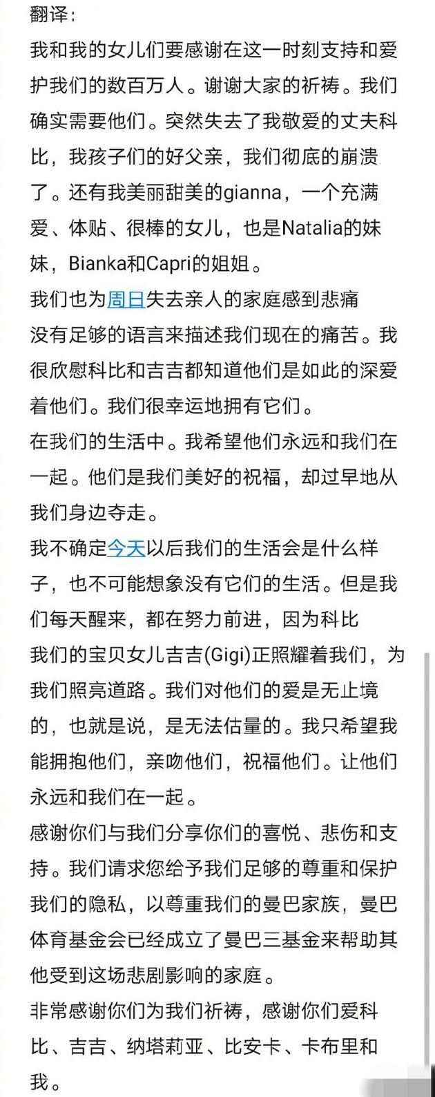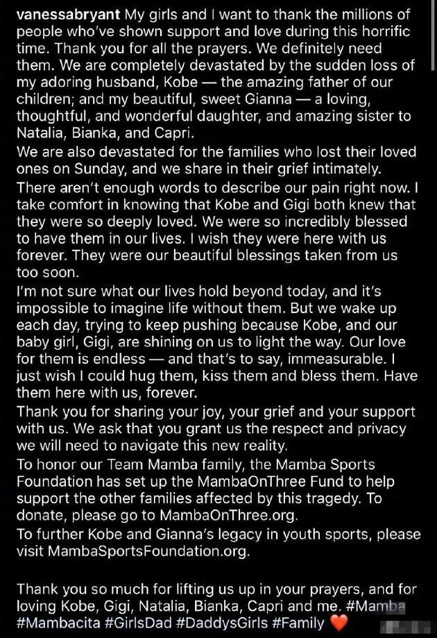 網(wǎng)易娛樂1月30日?qǐng)?bào)道 北京時(shí)間1月30日,科比妻子瓦妮莎在個(gè)人社交平臺(tái)發(fā)布長(zhǎng)文。這也是她在丈夫科比和二女兒吉安娜遇難后首發(fā)聲。